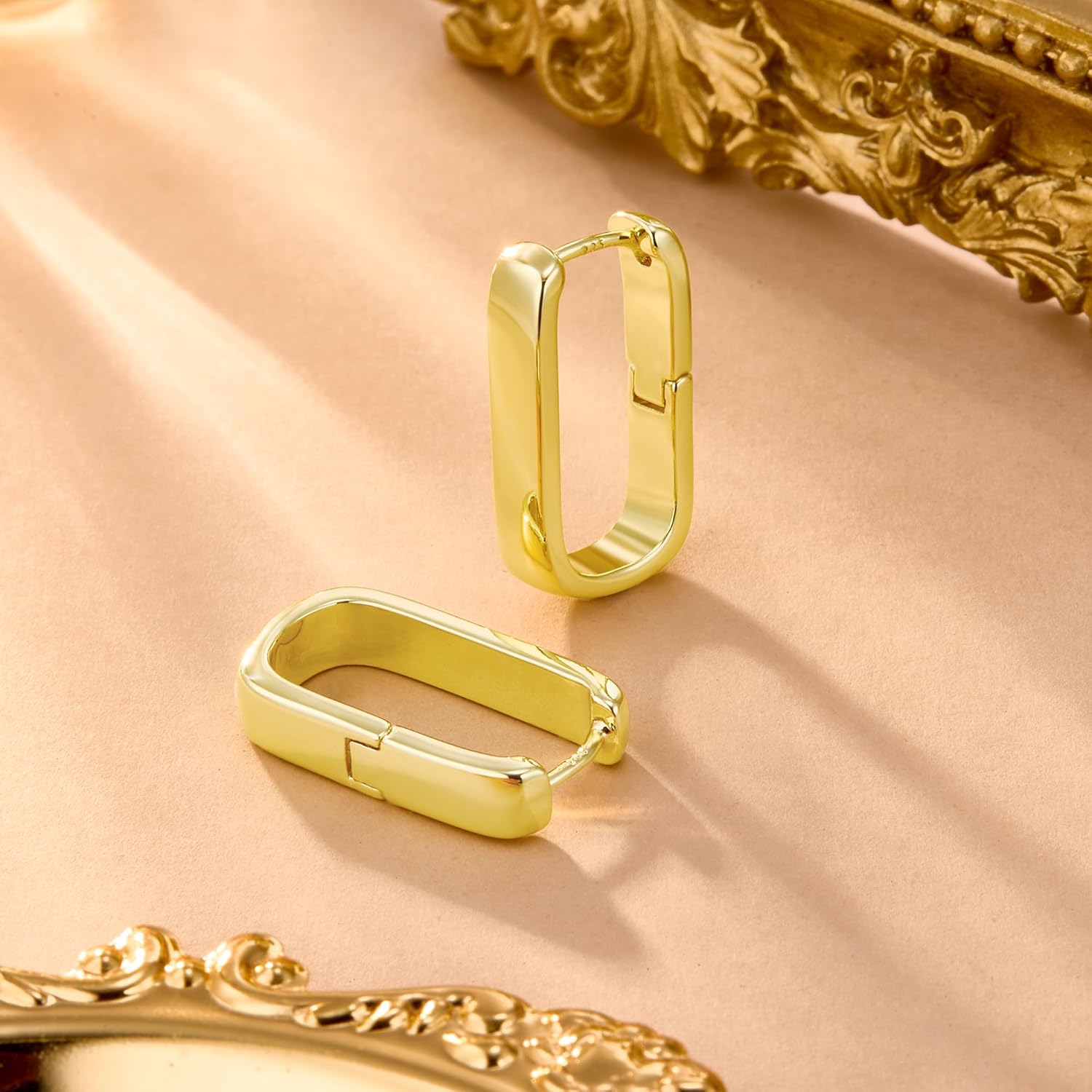 Package includes one pair of small gold geometric rectangular hoop earrings.